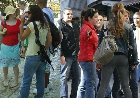 觀察蘿蕾博客上的照片可知,這些年輕女孩可能是陸軍士兵,從她們槍把子上面的紫藍(lán)色綢帶上看出來,有些是專業(yè)的M16步槍,屬軍用裝備,而非私人護(hù)身之用。加上以色列人不管男女都要服兵役,因此就算是回家休假槍也不離身,才能確保生命安全。
