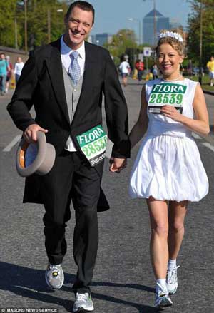 他們倆在比賽開(kāi)始后七小時(shí)零五分鐘才跑到終點(diǎn)。新娘把花束擲向群眾時(shí),新郎甚至有氣力支撐著她走過(guò)終點(diǎn)。皮特說(shuō):“這是我一生中最美好的一天,但我決定不再做這種事了!