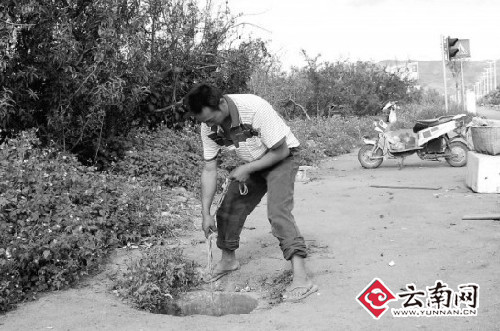 昨日下午,蒙自縣文瀾鎮(zhèn)高家寨的戴橋紅,正拎著一只水桶在紅河大道上找水,他找水的地方是紅河大道上的排污管道。在紅河大道的非機(jī)動(dòng)車道上,許多窨井蓋都不見了,紅河大道兩旁的果農(nóng)們,每天都會(huì)開著車或者騎著摩托來找水。