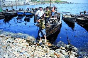 工作人員不斷向海里拋清油氈,一張清油氈可以吸收約70-80斤的石油。清污人員使用的工具主要為清油氈、消油劑和圍油欄。盡管清油氈和消油劑的數(shù)量非常大,但與大面積受污染海域相比,還只是一小部分。