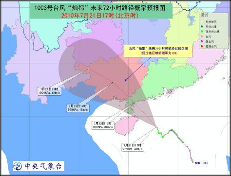 中新網(wǎng)7月21日電 中央氣象臺(tái)7月21日18時(shí)發(fā)布臺(tái)風(fēng)橙色預(yù)警:今年第3號(hào)強(qiáng)熱帶風(fēng)暴“燦都”于21日17時(shí)加強(qiáng)為臺(tái)風(fēng),17時(shí)其中心位于海南省文昌市東南方大約210公里的南海北部海面上,就是北緯19.0度,東經(jīng)112.8度,中心附近最大風(fēng)力有12級(jí)(33米/秒),中心最低氣壓為975百帕。
