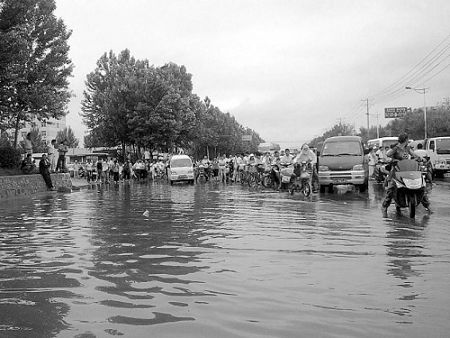 到了萬(wàn)芳廣場(chǎng)前,路面積水深達(dá)半個(gè)車輪,一些馬力不夠的小轎車不敢再開(kāi),或停在路邊等候,或鉆進(jìn)小胡同,只有大貨、吉普敢一試深淺。在四臺(tái)子檢車線附近,向北車輛在此被分流。本報(bào)采訪車苦行近2個(gè)小時(shí),終于到達(dá)堵車源頭——公鐵橋。