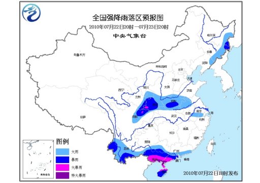中新網7月22日電 據(jù)中央氣象臺網站消息,中央氣象臺7月22日18時繼續(xù)發(fā)布暴雨黃色預警:預計,7月22日20時到7月23日20時,廣東沿海和西南部、廣西大部、海南、云南西部和南部、四川盆地西部、甘肅東部、陜西中南部、湖北西北部、河南大部、安徽北部和東南部、浙江西北部以及黑龍江東南部、吉林東部、遼寧東北部等地有大雨或暴雨,其中,廣東西南部、廣西南部、海南北部的部分地區(qū)有大暴雨或特大暴雨;四川盆地西北部、陜西西南部的局部地區(qū)有大暴雨;上述地區(qū)局地并伴有短時雷雨大風等強對流天氣。