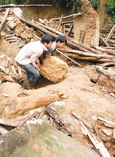 15歲的邵玉乾能撿回一條命完全得益于他的貪玩。24日上午,盡管雨大,他還是帶著小外甥到房子后面的山坡上玩,不巧,小外甥陷到泥里,全身濕透,他跑回去給拿了件衣服。剛到半山腰,突然,腳下好像地動(dòng)山搖,緊接著“卡啦卡啦”巨大的聲響,像爆炸一樣,山上的泥石流瞬間沖向?qū)γ娴纳狡,又折回頭沖向他這邊。他前面不遠(yuǎn)處的一排房子全倒了。他趕緊跑過去看,奶奶被泥石淤在腰部,大聲喊著救命。這時(shí),旁邊有人趕來,幾人用手刨了2個(gè)多小時(shí),奶奶終于被救出。但是,邵玉乾的姐姐邵玉娟、妹妹邵玉苗,卻被埋在泥石之下。