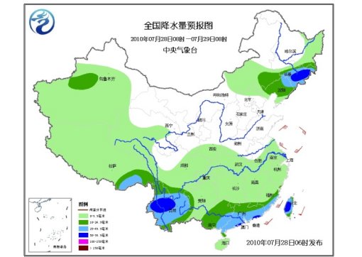 28日08時(shí)至29日08時(shí),新疆中南部、西藏大部、青海中南部和西部、甘肅東南部、陜西南部、內(nèi)蒙古中部、東北南部和東部、華北北部、江淮大部、江漢、江南、華南、西南大部等地有小到中雨或陣雨,其中,吉林中東部和南部、遼寧北部、西藏東南部、川西高原東南部、云南大部、廣西東部、廣東中南部、福建東部、臺(tái)灣大部等地有大雨或暴雨;上述局地并伴有短時(shí)雷雨大風(fēng)等強(qiáng)對(duì)流天氣。新疆東部、內(nèi)蒙古大部、東北東部等地有4~6級(jí)風(fēng)。受入海氣旋和西南季風(fēng)的共同影響,黃海南部將有9級(jí)大風(fēng),陣風(fēng)可達(dá)10級(jí);東海南部、臺(tái)灣海峽將有7~8級(jí)大風(fēng),陣風(fēng)可達(dá)9級(jí);黃海中部、南海北部將有5~7級(jí)風(fēng)。