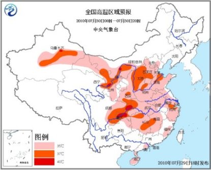 預計,明天白天,新疆吐魯番盆地及南疆盆地東部、內(nèi)蒙古西部偏南地區(qū)、甘肅大部、青海東北部、寧夏大部、陜西大部、華北大部、黃淮、江淮大部、江漢、江南大部、四川盆地、重慶、貴州東北部、海南大部等地有35~37℃的高溫天氣,其中,重慶、甘肅中部、吐魯番盆地等地局部最高氣溫可達40℃以上。