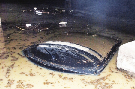 昨日凌晨1點(diǎn)過(guò),還在睡夢(mèng)中的張先生被窗外的雷鳴聲驚醒,接著他聽到樓下傳來(lái)喊叫,“車庫(kù)被淹了,快把外面的車開走!睆埾壬偷貜拇采吓榔饋(lái),火急火燎地跑向車庫(kù)時(shí),發(fā)現(xiàn)雨下不夠半小時(shí),車庫(kù)的積水已經(jīng)漲到3米深,里面的7輛汽車全部被淹沒(méi)頂。直到昨日下午7時(shí),車庫(kù)內(nèi)的淤泥還未被清理干凈。 (記者 薛小龍 攝影 呂甲 實(shí)習(xí)生 周烜)