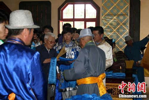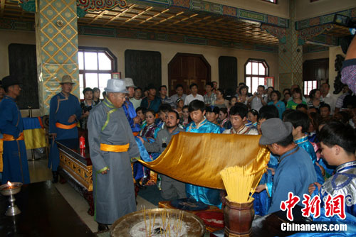 祈福儀式是在今天下午2時許開始的。在成吉思汗陵后殿供奉成吉思汗和夫人孛爾帖靈柩的靈包中,一位達爾扈特蒙古族老人手舉著延續(xù)將近800年不滅的長明燈,口誦禱文,為舟曲泥石流災(zāi)區(qū)人民祈福。