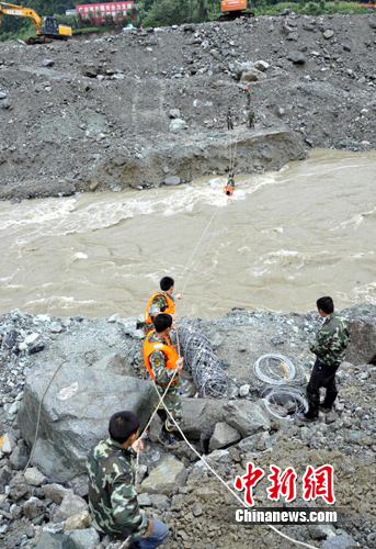 中新網(wǎng)映秀8月18日電(郭永全 張浪 鄢銀嬋)18日早6點,汶川消防大隊映秀消防站接到武警水電部隊求助電話,在位于映秀鎮(zhèn)堰塞湖處處理淤泥沙石拓寬河道的數(shù)十名機械工人因河道加寬,水流湍急,無法從原來搭設的繩橋往返對岸進行作業(yè)。
