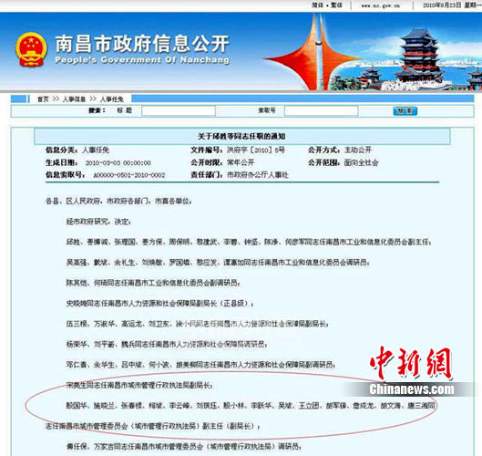 8月23日,中新網(wǎng)記者在南昌市政府信息公開網(wǎng)找到南昌市政府發(fā)布的洪府字[2010]5號(hào)文件,該文件名為“關(guān)于邱勝等同志任職的通知”(以下簡(jiǎn)稱為“通知”)。通知顯示,南昌市政府任命了一批南昌市工業(yè)和信息化委員會(huì)、市人力資源和社會(huì)保障局、市城市管理委員會(huì)(城市管理行政執(zhí)法局)以及市文化新聞出版局的官員。