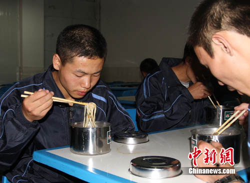 端著學(xué)校統(tǒng)一配發(fā)的新飯盒,孩子們在”新家“第一頓餐開灶了。“早就聽說蘭州的牛肉面非常有名”,高一(2)班的高興平毫不猶豫的走進(jìn)了一樓食堂!拔兜勒姘!”高興平豎著大拇指說,沒想到來這里吃得第一頓飯就是牛肉面。
