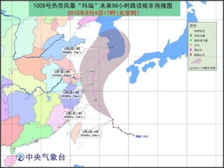 今年第9號熱帶風暴“瑪瑙”的中心9月4日17時位于浙江象山東南方大約680公里的洋面上,就是北緯25.7度,東經(jīng)127.3度,中心附近最大風力有8級(20米/秒),中心氣壓995hPa。