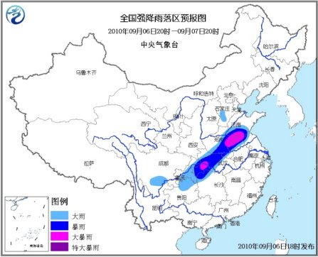 9月6日20時到7日20時,山東中南部、安徽北部、江蘇北部、河南東部和南部、湖北中西部、重慶中東部、貴州北部、湖南西北部以及川西高原東南部、河北西南部等地有大雨或暴雨,其中,湖北西南部、河南中部偏東地區(qū)、山東西南部、安徽北部、江蘇西北部等地局部有大暴雨;上述部分地區(qū)并伴有短時雷雨大風等強對流天氣。