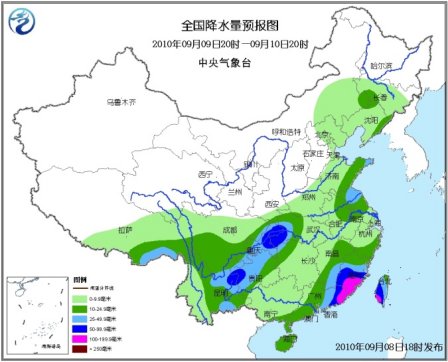 8日20時至9日20時,西藏中東部、青海南部、甘肅南部、寧夏南部、陜西、內(nèi)蒙古中部、華北大部、黃淮、江淮、江漢、江南大部、華南以及西南地區(qū)等地有小到中雨或陣雨,其中,四川盆地、川西高原中部、甘肅東南部、陜西南部、重慶西部和北部、福建東南部沿海、廣東中東部沿海、臺灣中南部等地有大雨或暴雨,四川盆地東北部局地有大暴雨;內(nèi)蒙古中部、山東半島東部、蘇皖中部、江西西部、廣西東南部、海南南部等地的部分地區(qū)有大雨;上述局部地區(qū)并伴有短時雷雨大風或冰雹等強對流天氣。新疆北部、甘肅西部、內(nèi)蒙古中西部和東南部等地有4~6級風。受10號熱帶風暴影響,臺灣海峽、臺灣以東洋面和以南海域、南海東北部有7~9級大風,風暴中心經(jīng)過的附近海域風力有10級,陣風11~12級;東海南部有5~7級東南風。黃海中北部有5~6級旋轉(zhuǎn)風;南海中部有5~6級西南風。