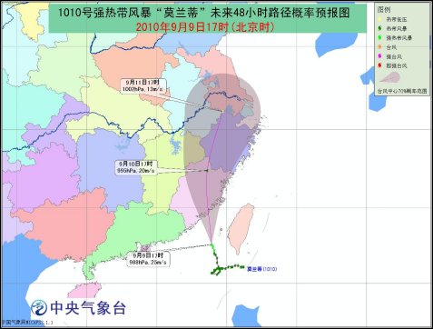 中新網(wǎng)9月9日電 據(jù)中央氣象臺(tái)網(wǎng)站消息,中央氣象臺(tái)9月9日18時(shí)發(fā)布臺(tái)風(fēng)黃色預(yù)警:今年第10號(hào)熱帶風(fēng)暴“莫蘭蒂”已于9月9日14時(shí)加強(qiáng)為強(qiáng)熱帶風(fēng)暴,17時(shí)“莫蘭蒂”的中心位于福建廈門南偏東大約220公里的南海東北部海面上,就是北緯22.6度,東經(jīng)118.9度,中心附近最大風(fēng)力有10級(jí)(25米/秒),中心最低氣壓為988hPa。