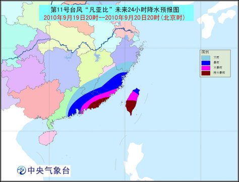 受其影響,未來24小時,東海南部、臺灣以東洋面、臺灣海峽、巴士海峽、巴林塘海峽、南海東北部、浙江南部沿海、臺灣及其沿海、福建沿海、廣東中東部沿海將有7-9級大風,其中福建中南部沿海、廣東東部沿海、臺灣海峽的部分海面或地區(qū)風力可達10-11級,“凡亞比”中心經過的附近海面或地區(qū)的風力有12-13級;福建大部、浙江南部、江西東南部、廣東中東部、臺灣等地將有大到暴雨,其中福建東南部、廣東東部、臺灣等地的部分地區(qū)有大暴雨,局地有特大暴雨。中央氣象臺已于今日18時發(fā)布了暴雨藍色預警。