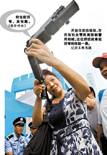 活動(dòng)吸引了許多男女老少慕名前來(lái)觀看,男孩子對(duì)各種各樣的新式武器特別感興趣,都想親自摸一摸試一試,女孩子則對(duì)扮相很酷的男特警、女特警很癡迷,紛紛掏出相機(jī)和手機(jī)拍照。