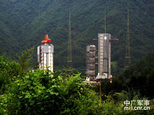車行一個小時左右,我們終于到達了向往已久的西昌衛(wèi)星發(fā)射中心。由于事先沒有經(jīng)過有關(guān)部門批準(zhǔn),此次我們不能進入發(fā)射中心核心區(qū)域進行采訪,只能乘車沿著窄窄的彎曲山路,圍繞著群山環(huán)抱下的發(fā)射場,也就是2號發(fā)射平臺和整裝待發(fā)的“嫦娥二號”遠遠地參觀一下。但即使這樣,我們還是能夠清晰地看到2號、3號固定發(fā)射塔和總裝廠房,呈三角形巍然屹立于山谷中。