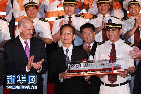 在連續(xù)參加多場(chǎng)雙邊活動(dòng)后,溫家寶總理在帕潘德里歐總理陪同下,隨即趕往中遠(yuǎn)比雷埃夫斯港集裝箱碼頭考察。