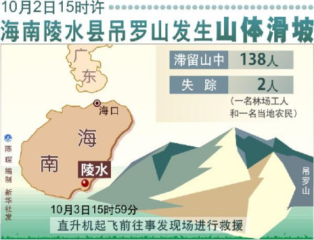 吊羅山區(qū)于2日15時(shí)發(fā)生山體滑坡事件,125名游客和13名吊羅山林業(yè)局工作人員被滯留山中。海南省和陵水縣有關(guān)部門原定于4日上午根據(jù)天氣變化情況擇機(jī)開展救援行動(dòng)。