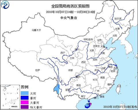 10月7日14時到8日14時,海南大部、廣東中西部沿海及雷州半島、云南西部的部分地區(qū)等地有大雨或暴雨,其中,海南東北部的部分地區(qū)有大暴雨。