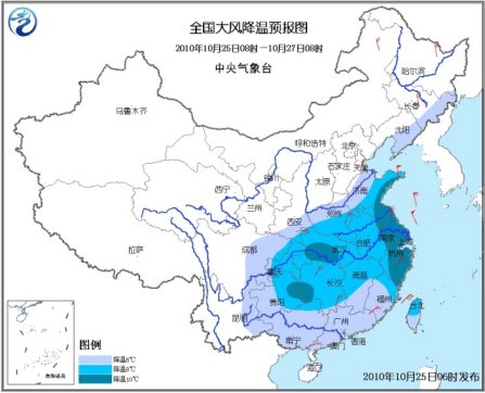 未來(lái)三天,隨著冷空氣繼續(xù)東移南下,主降溫區(qū)也將開(kāi)始向南轉(zhuǎn)移。中央氣象臺(tái)今天早晨6時(shí)繼續(xù)發(fā)布寒潮藍(lán)色預(yù)警。預(yù)計(jì),25日08時(shí)至27日08時(shí),東北東南部、華北南部、陜西南部、黃淮、江淮、江漢、江南、華南大部、西南地區(qū)東部等地將出現(xiàn)6~8℃降溫,其中,黃淮東部、江淮東部、江南東部、江漢南部、貴州東部、湖南西部等地的部分地區(qū)降溫幅度可達(dá)10℃;上述大部地區(qū)有4~6級(jí)偏北風(fēng)。