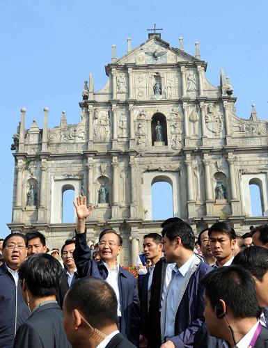 14日,溫家寶在澳門特別行政區(qū)行政長官崔世安的陪同下,先后參觀澳門大炮臺、澳門博物館、大三巴牌坊,考察了澳門生產(chǎn)力暨科技轉(zhuǎn)移中心、澳門工聯(lián)北區(qū)綜合服務(wù)中心、仁伯爵綜合醫(yī)院、澳門大學(xué)等機(jī)構(gòu),看望澳門廣大市民,和大家真情互動,深切了解澳門歷史和經(jīng)濟(jì)、社會發(fā)展情況。他還走訪市民家庭,了解澳門普通居民的生活現(xiàn)狀。