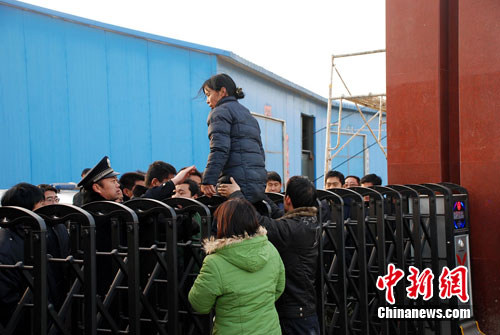 在雙方僵持不下的情況下,這名記者想翻門進入,但遭到數名看大門人的人墻式的阻攔。 經過反復僵持、協(xié)商,終于有一名記者被允許翻門進入。