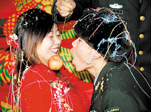 只見(jiàn)哨所營(yíng)房?jī)?nèi)外洋溢著一派喜慶的氣氛,戰(zhàn)友們列隊(duì)歡迎一對(duì)新人的到來(lái)。新建的保溫板房?jī)?nèi),大紅喜字貼滿了窗戶、墻壁。放鞭炮、迎新人、撒金紙、噴彩條、領(lǐng)導(dǎo)祝福、戰(zhàn)友祝賀、喝交杯酒、鬧新房……在中俄邊界259/4號(hào)界碑處,新人手拉著手,面對(duì)界碑許下誓言:“界碑見(jiàn)證我們的愛(ài)情!界碑不倒,愛(ài)情不變!”