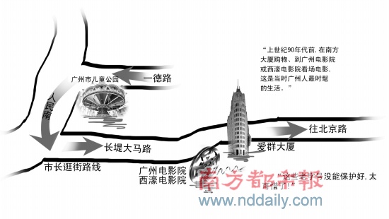 離開兒童公園,張廣寧沿人民南路向南走去。當(dāng)看到廣州電影院和西濠電影院的招牌時(shí),張廣寧還回憶說,上世紀(jì)90年代前,在南方大廈購物、到廣州電影院或西濠電影院看場電影,這是當(dāng)時(shí)廣州人最時(shí)髦的生活。眼前,廣州電影院已變成一家KTV,而西濠電影院則變成了一家網(wǎng)吧。見此情此景張廣寧立即要求致電主管部門,了解這幾家老字號(hào)的產(chǎn)權(quán)及消失原因。