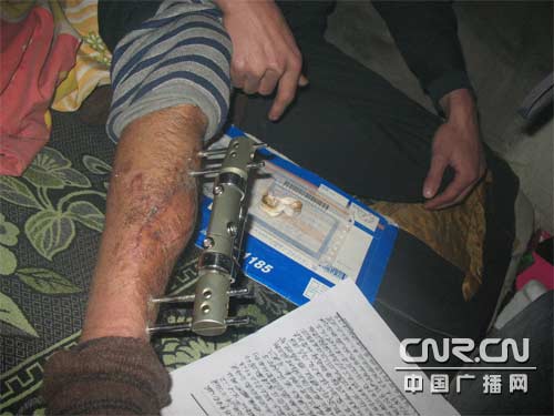 走進(jìn)李權(quán)柱租來的不足10平米的小屋時,屋里彌漫著嗆人的煤煙,但屋里的水缸卻結(jié)了冰。李權(quán)柱和他的愛人蜷縮在炕頭,挽起薄薄的秋褲,記者看到,一個60公分長的鐵夾深深地嵌進(jìn)李權(quán)柱的小小腿上,皮膚和鐵夾相連的地方還在往外流著膿水,李權(quán)柱就拿紙纏在鐵夾上。