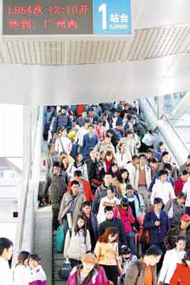 昨日上午10點半左右,昆明站已是人山人海,放眼望去,攜老扶幼、挎滿大包小包行囊的乘客正在秩序井然地通過安檢!白蛱斐丝瓦少很多,但今天一早開始,就明顯多了起來。和去年一樣,今年春節(jié)長假的客流回升期依然集中在初六、初七這兩天。”值班站長向婭說,昆明站春運期間臨時增設(shè)了車票大賣場,現(xiàn)在至廣州、廈門的臥鋪票每天早上8點以前基本就售完。而為了應(yīng)對節(jié)后的客運高峰,昨日增開了4趟省際、城際列車,分別發(fā)往廣州西、上海以及曲靖。