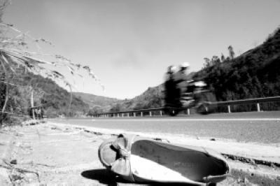 車禍發(fā)生的路段是沒(méi)有隔離欄的雙向兩車道路面,去年剛剛通車的路面情況較好。發(fā)生車禍的地方,只是一個(gè)不太急的彎道。雖然車禍已經(jīng)過(guò)去了10天,但通過(guò)車禍現(xiàn)場(chǎng)周圍散落的摩托車碎片、死者的衣物、血跡,仍讓人感覺(jué)到車禍發(fā)生時(shí)的慘烈情景。