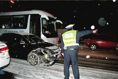 昨天,(北京)市交管局于清晨6點和晚高峰時分別啟動三級雪天疏導(dǎo)方案,加派3000名警力上路維護(hù)疏導(dǎo)。由于路面濕滑車速變慢,事故有所增多,傍晚雪情使晚高峰時間有所延長。昨晚8點開始,京津塘、京津第二高速、京沈高速先后被封閉。