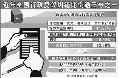 “行政復(fù)議化解行政爭議的作用日益明顯!2月19日,國務(wù)院法制辦主任曹康泰在全國行政復(fù)議工作經(jīng)驗(yàn)交流暨“雙先”、“雙優(yōu)”表彰大會(huì)上介紹,2008年,國務(wù)院共收到行政復(fù)議申請(qǐng)866件,比2006年增長近90%,全國每年通過行政復(fù)議化解的行政爭議約8萬件左右。