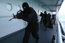 這時(shí),我利用甚高頻國際頻道和高音喇叭對(duì)恐怖分子進(jìn)行喊話,開展強(qiáng)大的心理攻勢(shì)和談判攻心。在談判未果的情況下,指揮員命令水面艦艇和空中火力支援的直升機(jī),同時(shí)對(duì)恐怖分子進(jìn)行火力壓制,掩護(hù)海上、空中突擊隊(duì)通過救生艇平面輸送和空中滑降的方式,快速、同時(shí)、多方位立體登臨被劫持貨輪。