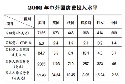 首先,應(yīng)當(dāng)看到中國國防費(fèi)的投入是適度有限的。近年來,中國的國防費(fèi)有了較大幅度的增長,似乎中國的國防費(fèi)已經(jīng)很多了,但如果以歷史的、聯(lián)系的,而不是以孤立的、片面的觀點(diǎn),來審視和分析中國的國防費(fèi)問題,就會得出一個中國的國防費(fèi)投入實(shí)際上并不多的客觀結(jié)論。從歷史上看,中國國防費(fèi)投入的增長帶有明顯的補(bǔ)償性。根據(jù)國家統(tǒng)計(jì)局有關(guān)公開資料,從1979年到1989年,國防費(fèi)平均增長為1.23%,與同期居民消費(fèi)價格總指數(shù)平均上漲7.49%相比,實(shí)際年平均負(fù)增長超過6%。從1990年到1997年國防費(fèi)年均增長15.8%,而同期居民消費(fèi)價格總指數(shù)平均上漲9.7%,中國國防費(fèi)排除物價因素后實(shí)際年均增長只有6.1%。直到1998年國家物價指數(shù)比較平穩(wěn)之后,為降低長期經(jīng)費(fèi)不足給國防和軍隊(duì)建設(shè)帶來的影響,國防費(fèi)投入才逐步有了較大幅度的實(shí)際增長。在長達(dá)10多年的“忍耐”過程中,中國國防和軍隊(duì)建設(shè)因經(jīng)費(fèi)不足而受到很大影響。從中國自身的情況看,中國國防費(fèi)的支出也是極其有限的。以這次兩會公布的有關(guān)數(shù)字為例,2009年中國國防費(fèi)預(yù)算比上一年度執(zhí)行數(shù)增加了14.9%,占全國財(cái)政支出預(yù)算的6.3%,與前幾年相比,所占比重略有下降,而同期教育費(fèi)增長22.5%、醫(yī)療衛(wèi)生費(fèi)增長20.9%、社會保障和就業(yè)費(fèi)增長23.1%、環(huán)境保護(hù)費(fèi)增長22.3%、保障性安居工程經(jīng)費(fèi)增長199.6%,可見國防費(fèi)的增長在各項(xiàng)社會事業(yè)費(fèi)的增長中是相對偏低的,中國始終堅(jiān)持把主要的財(cái)力用于改善民生。再從國際上看,中國與美、英、法、俄、日等國家相比,無論是國防費(fèi)占國家國內(nèi)生產(chǎn)總值(GDP)的比重還是占國家財(cái)政支出的比重,無論是國民人均國防費(fèi)還是軍人人均國防費(fèi)投入等主要指標(biāo)都是比較低的(如右表所示)。
