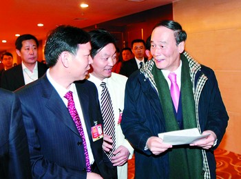 昨日下午4時許,王岐山參加完湖南代表團的討論后,黃志明將準備已久的《關于成立國有社保銀行的建議》交到王岐山的手中!斑@是我一個基層代表的建議,希望對國家有所幫助,并請多多指導!”黃志明激動地說!爸x謝你,我會認真看的。”王岐山接過黃志明的建議笑著表示。