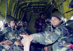 這支女子跳傘隊(duì)自1991年7月組建至今,隊(duì)員們跳過了裝備到空降兵部隊(duì)的各種傘型、各種機(jī)型,經(jīng)歷了南疆海島、水網(wǎng)稻田、戈壁沙漠、鄂北原始森林等各種復(fù)雜地形的空降演習(xí)和試訓(xùn)任務(wù),成為空降兵部隊(duì)能跳任何機(jī)型、傘型,敢跳高、新、險(xiǎn)科目的“專業(yè)”傘兵。她們過硬的軍事技能,無不來自于她們一次次搏擊風(fēng)浪、一次次趟過空降領(lǐng)域“沼澤地”的不平凡的經(jīng)歷。
