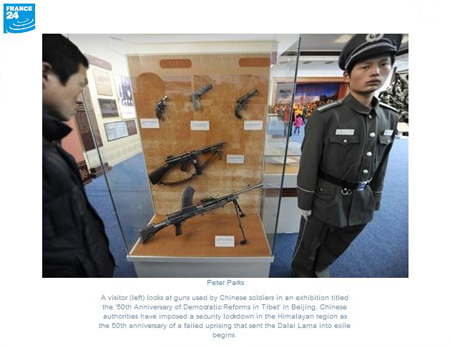 在北京舉辦的西藏民主改革50周年大型展覽中,展覽主辦者選取了幾件解放軍在1959年平息西藏武裝叛亂時(shí)繳獲的叛亂分子使用的美制和英制武器?裳酃饷翡J的網(wǎng)友卻發(fā)現(xiàn),法新社記者在3月6日的圖片報(bào)道中卻將這些武器說(shuō)成是“中國(guó)軍隊(duì)使用的武器”。