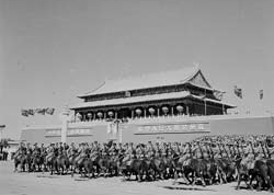阿木古楞:受閱壓力很大,覺得在天安門接受毛主席檢閱,比打錦州沖鋒陷陣還緊張啊。記得閱兵總指揮楊成武在會上對各部隊(duì)指揮員說,誰的馬驚了,就撤團(tuán)長的職。我們真擔(dān)心出岔子啊。部隊(duì)訓(xùn)練很刻苦,士兵很下功夫。在北京駐訓(xùn)時正是炎夏,北京熱呀。我們騎兵常年駐在草原,涼快慣了,熱得人和馬都受不了。我們每天早上4時起床,5時就開始訓(xùn)練,練到10時才休息,下午接著練,一直練到黃昏。特別是馬不好練。我們的馬都是從戰(zhàn)場上下來的,打仗可以,騎手雙腿一夾,馬撒腿就往上沖,現(xiàn)在不行,必須步伐整齊。要踩著音樂,跟上拍子。