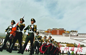2001年7月29日晚,一聲巨響,布達拉宮白宮頂部一座五彩寶幢突遭雷擊。官兵們聞聲立即趕到現(xiàn)場,冒著生命危險,在雷雨交加中用塑料薄膜把殘損的寶幢包嚴實。為防止再發(fā)生意外,官兵們雨夜堅守了6個多小時。