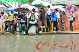 見聞:路兩邊的水很深,至少有1米寬的路面都浸在10厘米深的水里。站在華景路口的行人天橋上,中山大道從東往西方向全是一動不動的大車小車,從西往東則一輛也沒有。心里涼了半截,車肯定都堵在崗頂“大水坑”了。