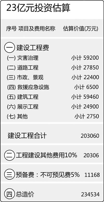 “主題為‘永恒北川’的北川國(guó)家地震遺址博物館整體設(shè)計(jì)方案已經(jīng)有關(guān)部門(mén)原則性通過(guò),初步預(yù)算總投資為23.45億元,資金一經(jīng)劃撥,將即時(shí)開(kāi)建!