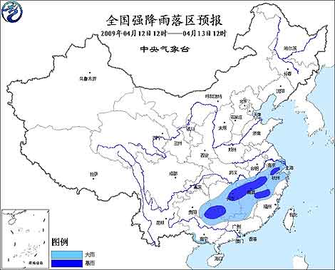 中新網(wǎng)4月12日電 據(jù)中國(guó)天氣網(wǎng)消息,中央氣象臺(tái)2009年4月12日10時(shí)發(fā)布暴雨預(yù)報(bào):
