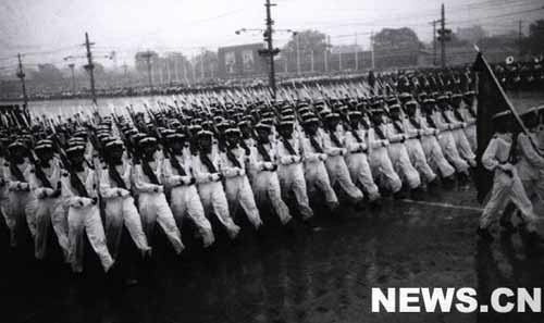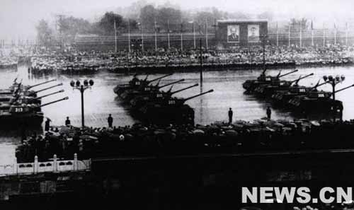 接著,分列式開(kāi)始。軍事學(xué)院、步兵學(xué)校、炮兵學(xué)校、工程兵學(xué)校、坦克學(xué)校、航空學(xué)校、海軍學(xué)校的隊(duì)伍和水兵、公安軍、步兵師、摩托化步兵、傘兵、炮兵部隊(duì)、坦克部隊(duì)相繼通過(guò)了天安門(mén)廣場(chǎng)。