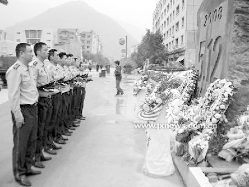 帶著全體江西消防官兵的哀思,“重返戰(zhàn)場”的官兵們來到映秀鎮(zhèn)的遇難同胞公墓,獻上潔白的花圈,肅立脫帽,緬懷在地震中遇難的同胞。