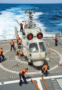整個護(hù)航期間,編隊(duì)艦載直升機(jī)值班和飛行任務(wù)相當(dāng)繁重,警戒巡邏、應(yīng)召支援、勤務(wù)運(yùn)輸、垂直補(bǔ)給,都離不開艦載直升機(jī),它們時刻處于戰(zhàn)備值班狀態(tài)。3月2日,“武漢”艦艦載直升機(jī)先后3次起飛,對40艘可疑目標(biāo)實(shí)施查證驅(qū)離,任務(wù)之繁重創(chuàng)造了護(hù)航單日之最。