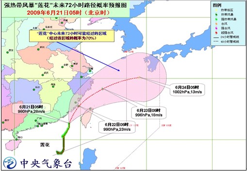 預(yù)計,“蓮花”將以每小時15公里左右的速度向北偏東方向移動,逐漸向福建福清到漳浦一帶沿?拷,有可能于今天下午到夜間在這一帶沿海登陸;也有可能擦過福建省近海海面,沿臺灣海峽向東北方向移動,強(qiáng)度逐漸減弱。