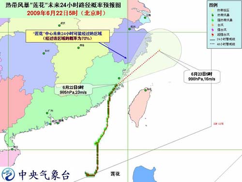 中新網(wǎng)6月22日電 中央氣象臺今天早晨六時發(fā)布臺風(fēng)消息:今年第3號熱帶風(fēng)暴“蓮花”(LINFA)已于昨天晚上8時30分前后在福建晉江東石鎮(zhèn)登陸,登陸時中心附近最大風(fēng)力有9級(23米/秒)!吧徎ā钡顷懞笙虮逼珫|方向移動。今天早上5時風(fēng)暴中心位于福建省莆田市境內(nèi),就是北緯25.5度,東經(jīng)119.1度,中心附近最大風(fēng)力有9級(23米/秒)。